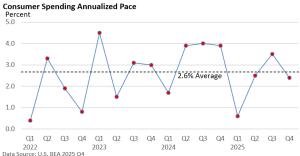 Consumer spending rose at an annualized rate of 2.4% in Q4 and is near the four-year average of 2.6%, according to US BEA data. In addition, business spending and investment continue to rise, partly driven by massive outlays for AI data centers.