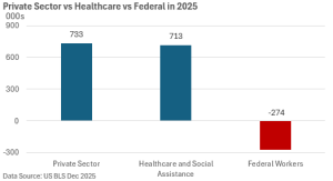 During 2025, private-sector payrolls rose by 733,000, with nearly all the gains occurring in one sector—healthcare. Meanwhile, the federal workforce was down by 274,000 last year. Manufacturing shed 68,000 positions.